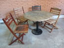 Lote nr. 002 - Mesa redonda de madera con base de metal 95x95cm Alto:0,75cm + 4 sillas de madera plegables ( en buenas condiciones, con detalles estéticos )