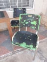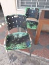 Mesa de madera fija (con detalles) medidas 70,5x70,5x75 cms. + 4 sillas de plástico con estructura de metal