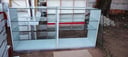 Estante de madera con 2 divisorias y 6 bases de vidrio con faltante de 2 porta base para sostener el vidrio (Largo 1.04m, Alto 1.08m, Ancho 50cm)