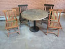 Lote nr. 002 - Mesa redonda de madera con base de metal 95x95cm Alto:0,75cm + 4 sillas de madera plegables ( en buenas condiciones, con detalles estéticos )