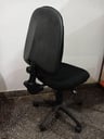 Silla de oficina para espera color azul (parte del respaldero trasero de plástico seco y roto ) Alto:0,75m Ancho: 0,50cm + Silla de oficina giratoria y ajustable con rueditas color negro * Buen estado Alto: 1,00m Ancho: 0,50cm