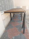 Lote nr. 004 - 2 Mesas de madera fija con estructura de metal (le falta maderitas) medidas 81x83x78 cms. aprox. + 3 sillas de plásticos con estructuras de metal(con detalles)