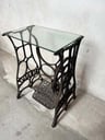 Estructura de metal a pedal antiguo para máquina de coser con base de vidrio. Estructura: Ancho 51cm, Largo 41cm, Alto 71cm, Vidrio: Ancho 70cm, Largo 27cm