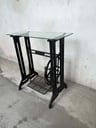 Lote nr. 019 - Estructura de metal a pedal antiguo para máquina de coser con base de vidrio. Estructura: Ancho 51cm, Largo 41cm, Alto 71cm, Vidrio: Ancho 70cm, Largo 27cm