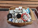 Caja con artefactos varios tomacorrientes, llaves y otros (en el estado en que se encuentra)