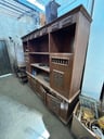 Mueble colonial robusto de madera maciza con compartimientos amplios, estantes abiertos, bar para vinos y tallados decorativos en puertas y cenefas. (OBS.: este lote se encuentra en LUQUE).
