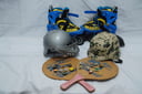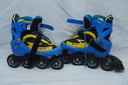 Par de patines infantil de 4 ruedas en línea de la marca Oxer, modelo Byten Line talle 32 al 35 (ajustable) (Buen estado, poco uso) + 2 Cascos de plástico (Buen estado) + 2 Raquetas de madera (con detalles) + 17 Pines para crocs (Buen estado)