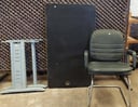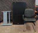 ESCRITORIO CON BASE DE METAL SIN CAJONES A REPARAR DE 1,23 METROS DE LARGO X 0,69 CM DE ANCHO X 0,74 CM DE ALTO + SILLA DE ESCRITORIO CON PATAS DE METAL Y TAPIZADO EN CUERO SINTETICO COLOR NEGRO A REPARAR