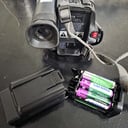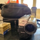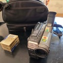 Cámara filmadora Sony, con sus cables y casettes con estuche (Enciende con pilas, se desconoce su funcionamiento total)
