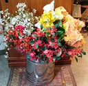 MASETERO DE METAL CON RUEDITAS DE 95 CM DE ALTO X 32 CM DE DIAMETRO + LOTE DE DIFERENTES FLORES DE DECORATIVAS