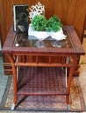 MESITA CUADRADA CON TAPA DE VIDRIO CON DETALLES EN CUERO Y METAL DE 61 CM DE ALTO X 61 CM DE ANCHO + ADORNO EN FORMA DE CORAL + ADORNO EN FORMA DE ROSAS DE CERAMICA + PLANTITAS + CAJITA DECORATIA EN FORMA DE LIBRO DE